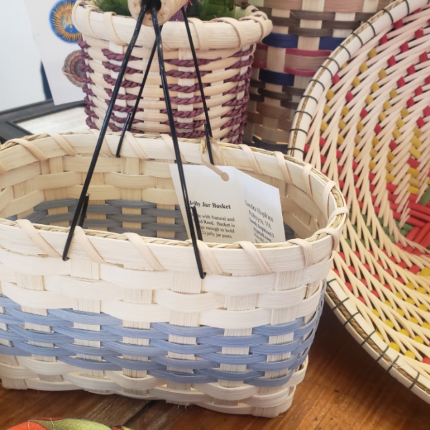 Sandy Hopkins is a basket maker and wheat weaver. She learned from some of the best basket makers in the Northeast such as Dianne Stanton, JoAnn Kelly Catsos, Jill Choate and Flo Hoppe. Now Sandy creates her own basket designs, dyes her own reed and creates a variety of straw and wheat ornaments and dollies. She likes to make traditional Cherokee and Shaker designs, rib baskets with antlers, and Nantucket style baskets. Her traditional wheat designs are primarily made with black bearded and turkey red wheat. Basket materials include hand pounded black ash, Hamburg cane, waxed linen, reed, wood splints and bases. She lives with her husband Bill, and dog Dakota, on a small farm in Fork Union, VA. They raise cows, chickens and broom corn for handmade brooms and swags.
